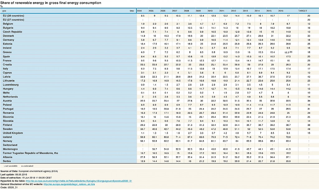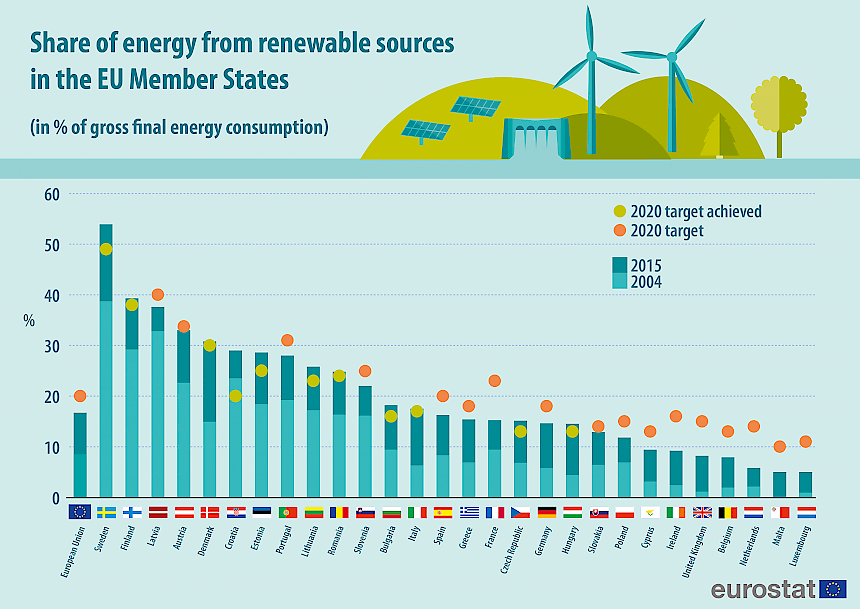 欧盟委员会根据欧盟统计局收集的数据,2018年1月25日的一份新闻稿显示,11个欧盟成员国已经实现了2020年可再生能源消耗目标。