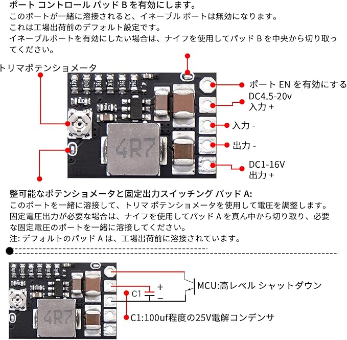 • 输出电压可调整或固定---小降压转换器板可以改变可调节的输出电压或固定。 监管采用默认调节电压输出。 如果需要固定电压输出,需要使用刀等尖锐物品切断垫A,需要焊接所需的固定电压端口。