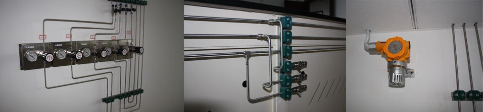 8.气瓶间内的气体钢瓶与压力调节器之间采用SS316L高压金属软管连接无渗透。高压软管为柔性软管,以保证连接的方便性。并自导防护钢缆,预防极端情况下,钢瓶阀损坏等现象带来的高压“抽鞭”事故。压力调节器与管道的连接方式为双环卡套。