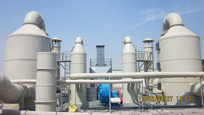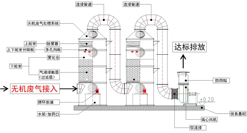 该实验室为土壤消解及提取,所使用试剂(高浓度高氯酸、硝酸等)用量大、浓度高,排出尾气为高浓度未能完全被分解的高氯酸及硝酸气雾,单塔难以充分完全处理,故采用双塔二级处理方式。