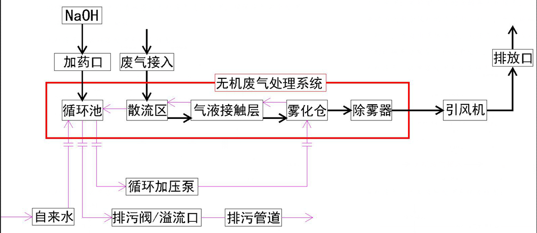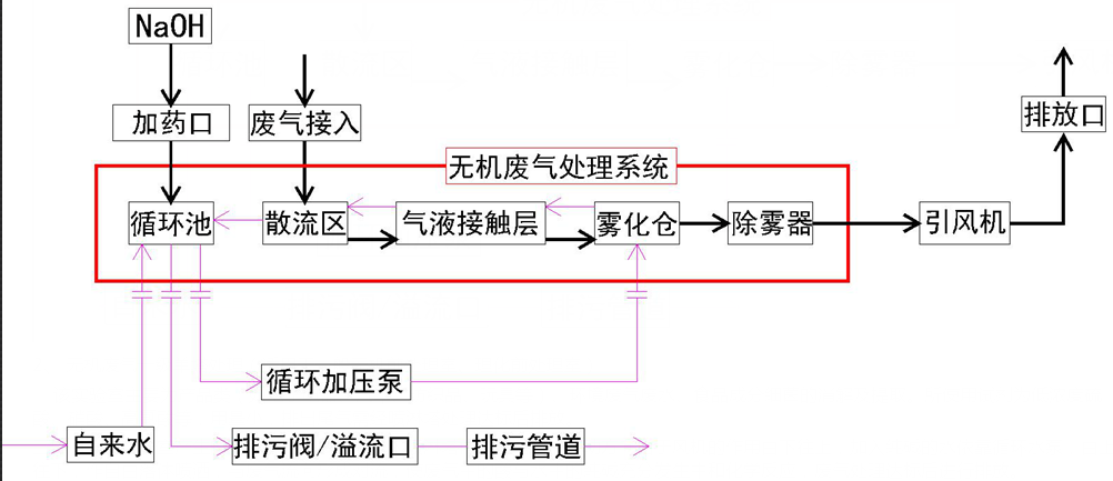 工作原理:实验室产生的浓度高未能完全被分解的高氯酸及硝酸气雾,首先进入一级喷淋塔,在塔内的流动方向由于风机的作用由下往上,加入纯碱的水依靠循环水泵,由上往下,作自由落体喷洒,与废气流向形成对流,使废气中的酸与水中的纯碱充分发生中和化学反应,经过一级喷淋塔处理后的废气由于浓度较高,可能存在未完全处理干净的情况,故再次使用喷淋塔对无机废气进行处理,确保废气完全处理干净,达标后进行排放。