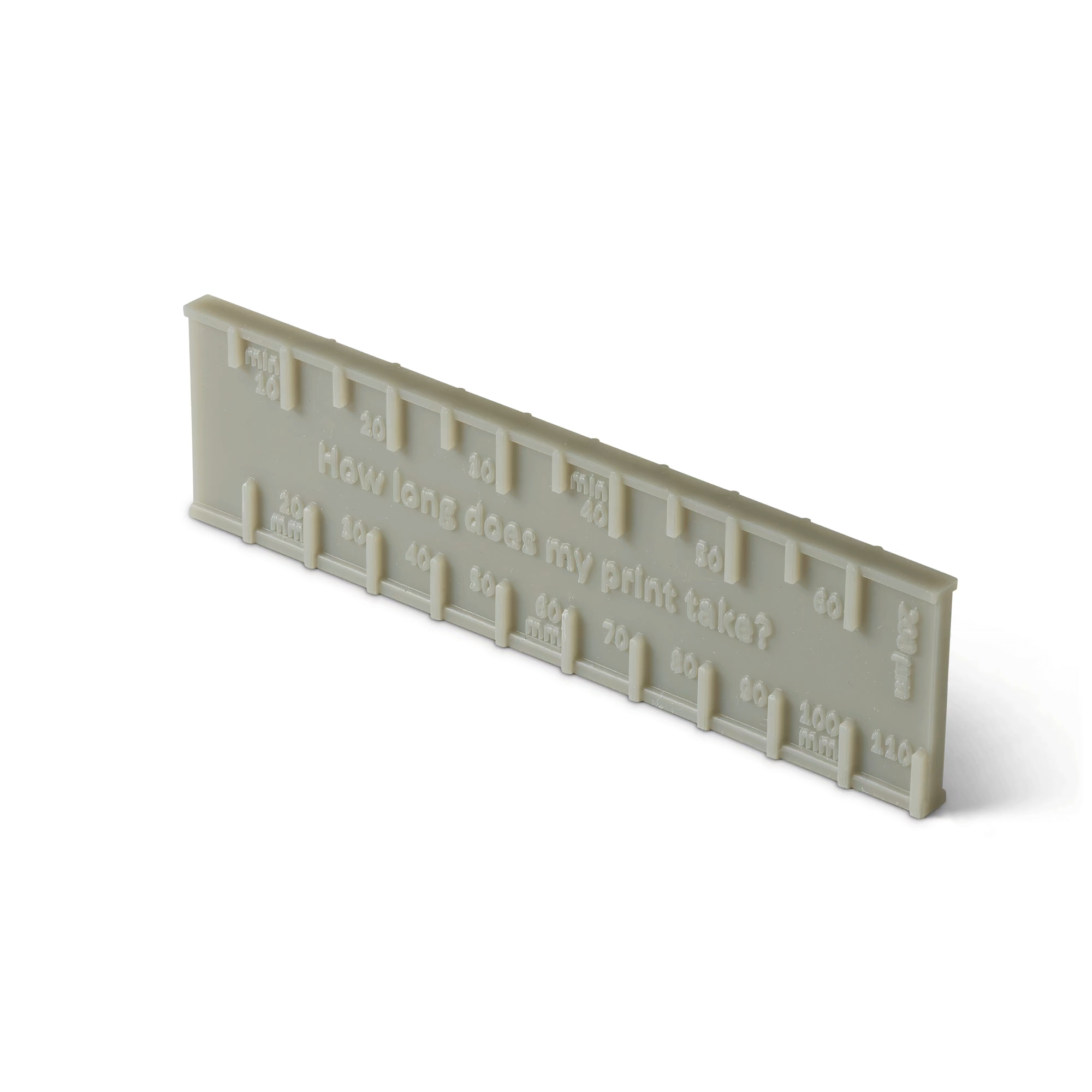 层厚度: 200 μm所用树脂: 11.2 mL打印时间: 19 分钟内打印 31 个部件3D 打印树脂,打印速度高达每小时 100 毫米。可在几分钟内打印牙科模型,或在两小时内打印大型原型。该部件是一把标尺,指示打印需要多长时间。一侧标记了 100 μm 层高的打印时间,另一侧显示 200 μm 层高的预计时间。可以通过测量部件在打印方向上的垂直高度来估算打印时间。